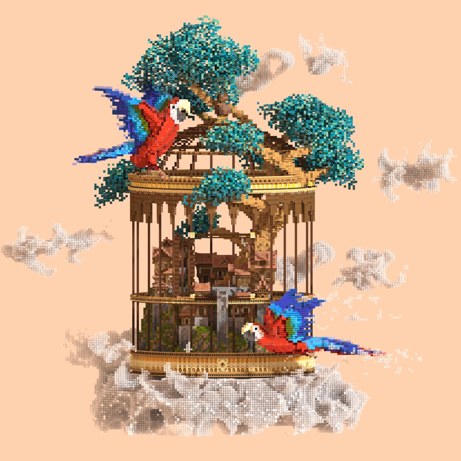 致敬同名Vocaloid传说曲。作品将初音未来置于一个幽静而唯美的深海世界,残破的鸟居、绚丽的珊瑚与鱼群环绕四周。光线穿透水面,营造出既梦幻又带有一丝忧郁的氛围,是一幅极具叙事感的体素艺术画卷。